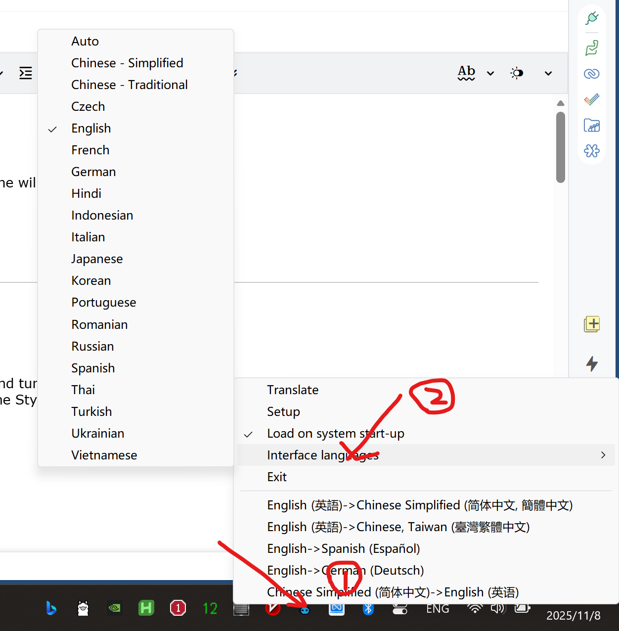 Aby zmienić język interfejsu, przejdź do prawego dolnego rogu ekranu w zasobniku systemowym Windows i kliknij PRAWYM przyciskiem myszy ikonę GT4T (niebieska głowa robota), a następnie kliknij „Języki interfejsu” i wybierz żądany język.